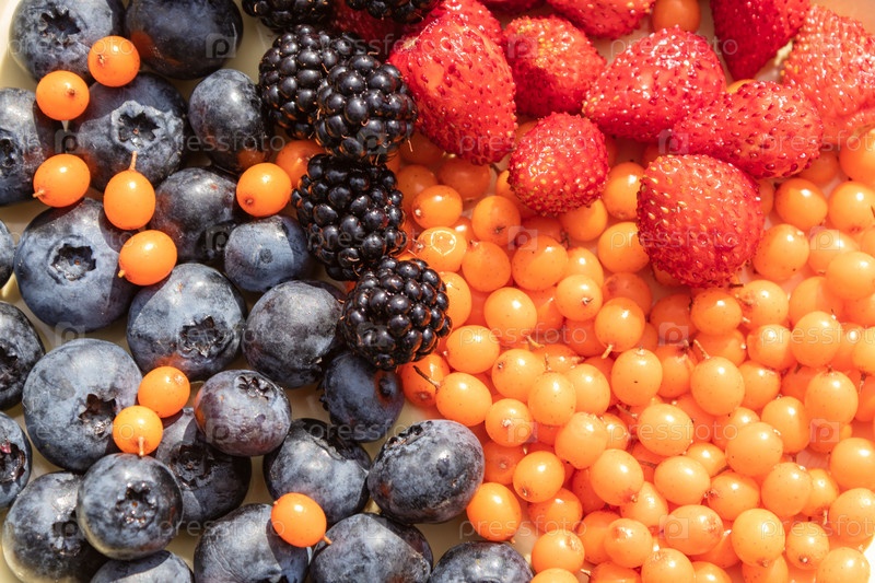 Смешанные разнообразные ягоды, собранные на участке, ягоды в ассортименте из ежевики, клубники, черники, облепихи. Красочная и здоровая концепция. Черный, синий, красный, зеленый. крупным планом