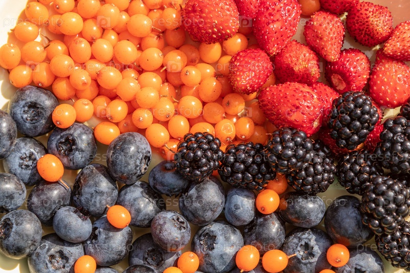 Различные ягоды, собранные в саду. ежевика, клубника, черника, облепиха. крупным планом