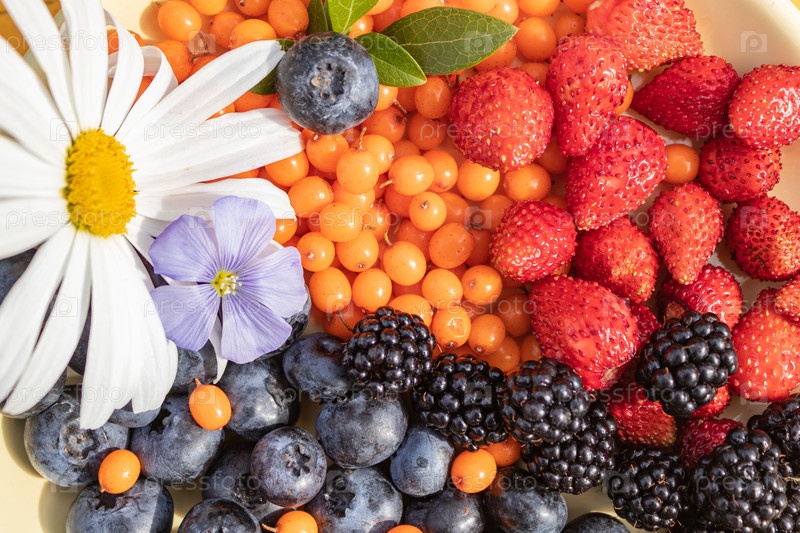 Различные ягоды, собранные в саду. ежевика, клубника, черника, облепиха. крупным планом