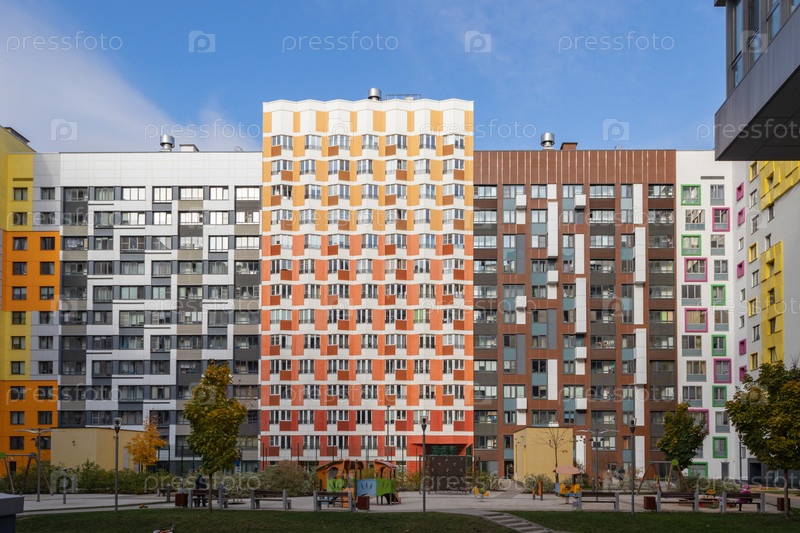 Современный многоквартирный дом с красочными фасадами на окраине города. Жилой комплекс «В лесу», Москва, Россия