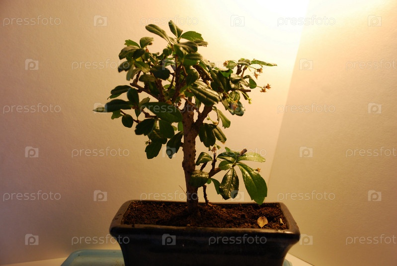 Небольшое дерево бонсай кармона мелколистная. На светло-желтом фоне в прямоугольном черном горшке растет небольшое деревце бонсай – вечнозеленый кустарник, который со временем достигает высоты около 40 см