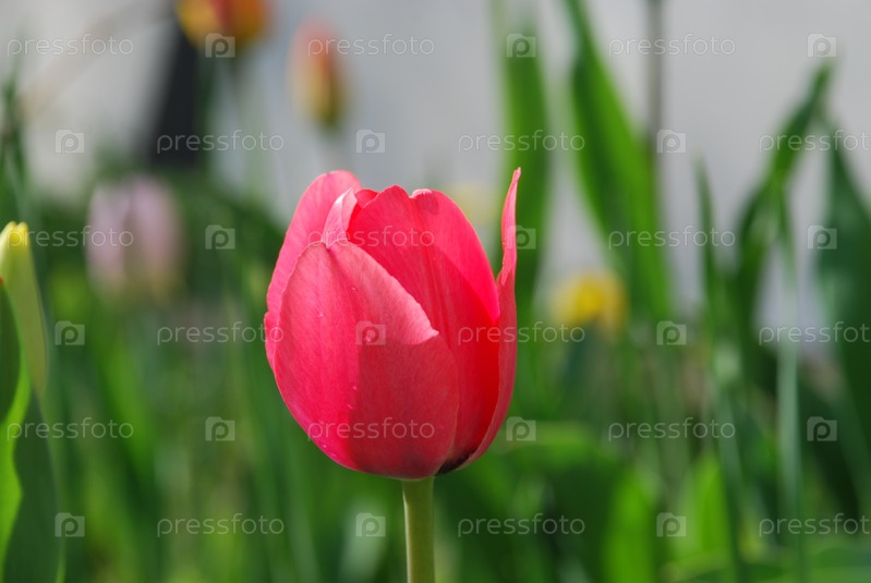 Бутон красного тюльпана среди зелени. Красный полураспустившийся цветок тюльпана на тонком зеленом стебле в окружении широких листьев на фоне зеленых трав