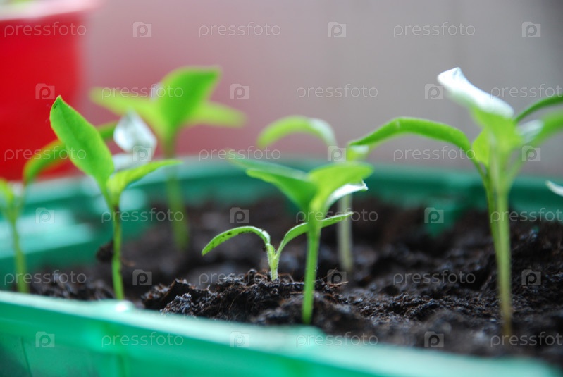 Маленькие всходы рассады болгарского перца. Проросшие саженцы культурных растений паприки на подоконнике. Недавно из земли вылезли небольшие зеленые побеги