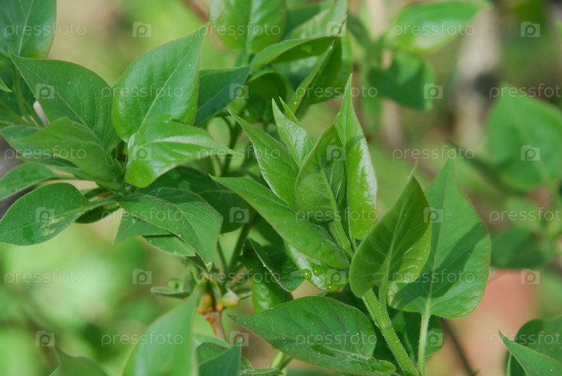 Листья сирени весенним вечером. Свежие зеленые листья сиреневого куста сирени. Крупные фактурные зеленые листья заполняют всю плоскость изображения