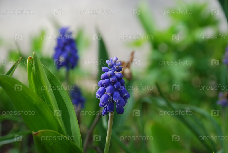 Мускари армянский или мышиный гиацинт. На тонком зелено-фиолетовом стебле маленькие голубые закрытые бутоны мелких цветков мускари. Под ярким весенним солнцем