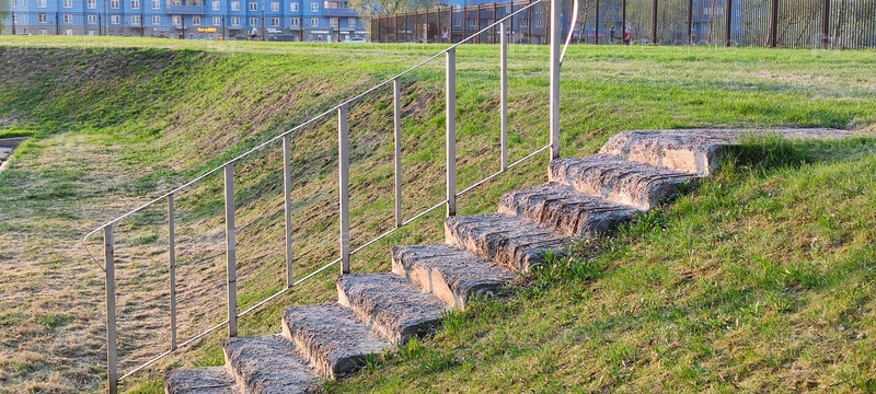 Старая бетонная лестница с перилами посреди холма. На улице среди зеленой травы есть небольшая лестница с бетонными ступенями и металлическими перилами