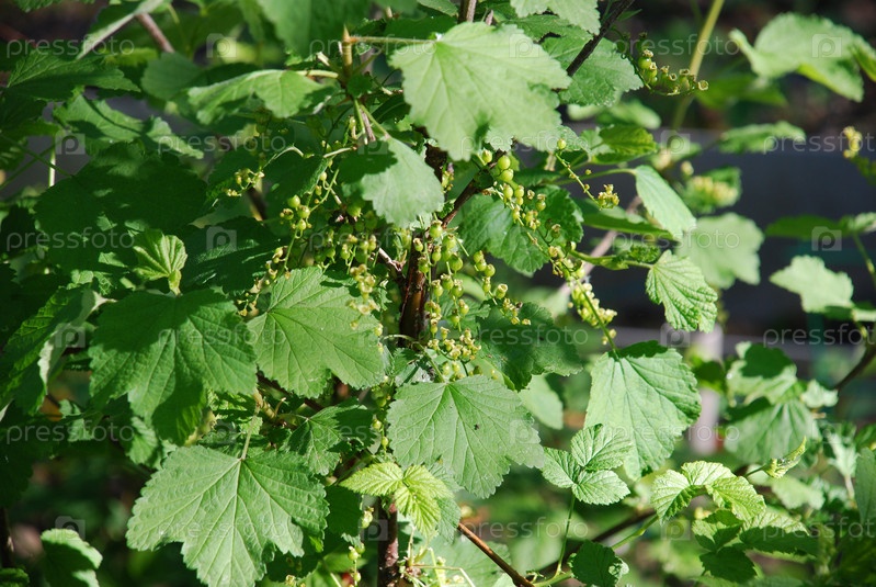 Под яркими лучами солнца на коричневых ветвях висят зеленые листья и только завязанные красные ягоды смородины