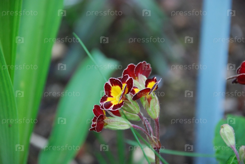 Желто-красные мелкие цветки. Три ярких, в центре желтых по краям бордовых цветков первоцвета. Часть бутонов раскрыта, часть еще не распустилась, вокруг зеленая листва