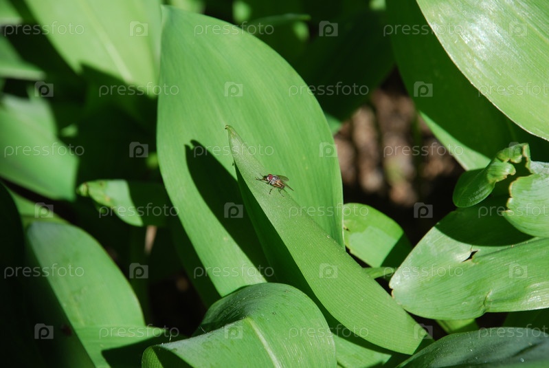 Крупные, широкие листья ландыша. Несколько зеленых широких крупных мушек цветка ландыша растут рядом друг с другом на одном листе, на котором сидит муха. Листья освещены солнцем