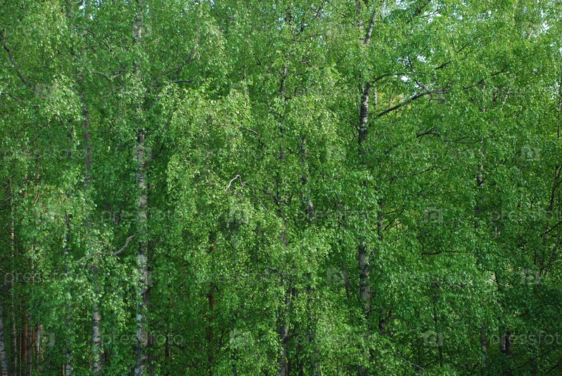 Зеленая стена леса на солнце. В солнечный весенний день несколько высоких деревьев стоят рядом друг с другом с зеленой листвой, образуя высокий зеленый занавес