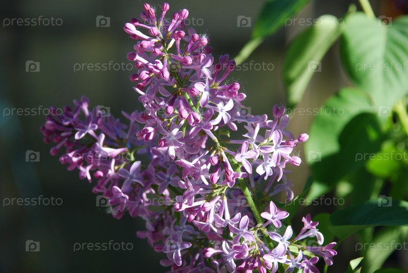 Светло-фиолетовые сиреневые цветы. На зеленом фоне много маленьких фиолетовых цветов, растущих на одной ветке. Цветы и листья освещены солнцем. Лепестки цветка частично сомкнуты, частично открыты