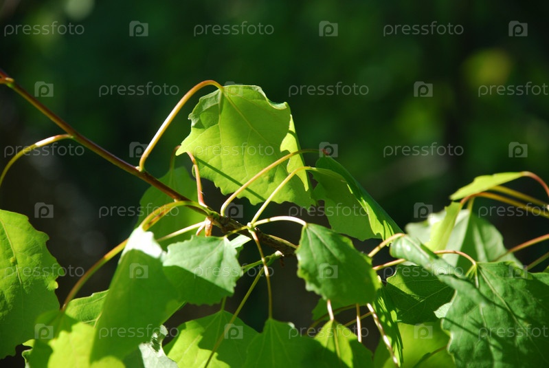 Ветка осины с листьями. Крупный план зеленых круглых листьев осины. Они висят на тонких стеблях на фоне других листьев и зелени, освещенных лучами солнца