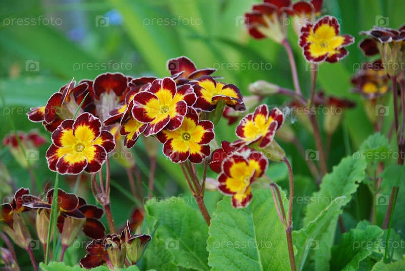 Желто-красные мелкие цветки. Три ярких, в центре желтых по краям бордовых цветков первоцвета. Часть бутонов раскрыта, часть еще не распустилась, вокруг зеленая листва