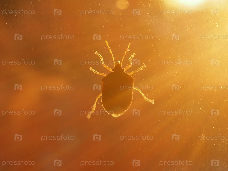 Коричневый мраморный вонящий клещ (Halyomorpha halys) животное типа Euarthropoda Hexapoda, клад Pancrustacea, класс Insecta (насекомые) на закате