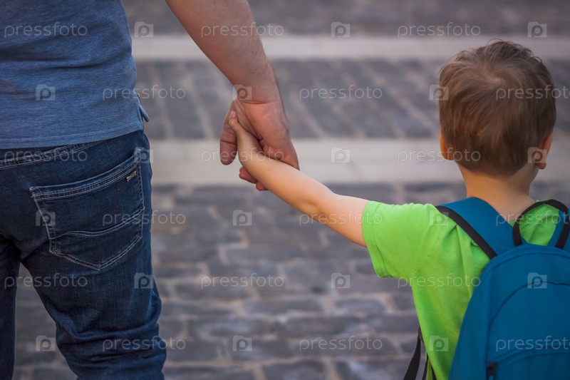 Отец держит сына за руку во время прогулки по городской улице. Путешествовать. Образ жизни в городе. Центр, улицы