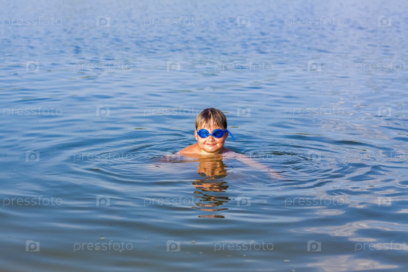 Счастливый ребенок плавает в реке в очень жаркий летний день. Купайтесь в водоемах. Счастливая семья веселится и плещется в воде летом