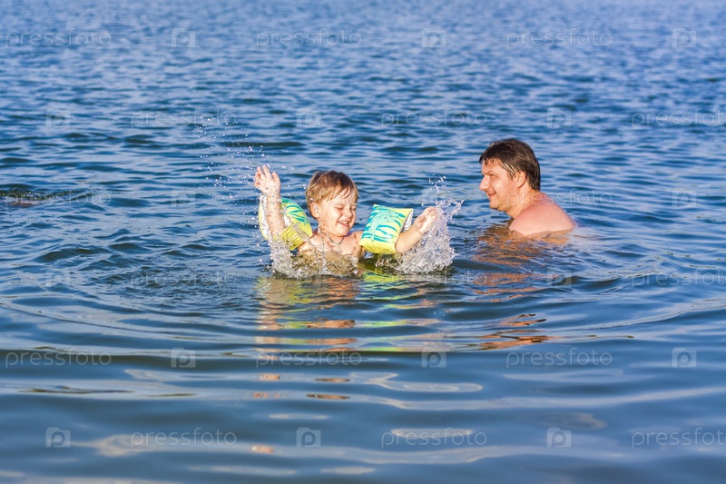 Семья, отец и его сыновья купаются в реке в очень жаркий летний день. Купайтесь в водоемах. Счастливая семья веселится и плещется в воде летом