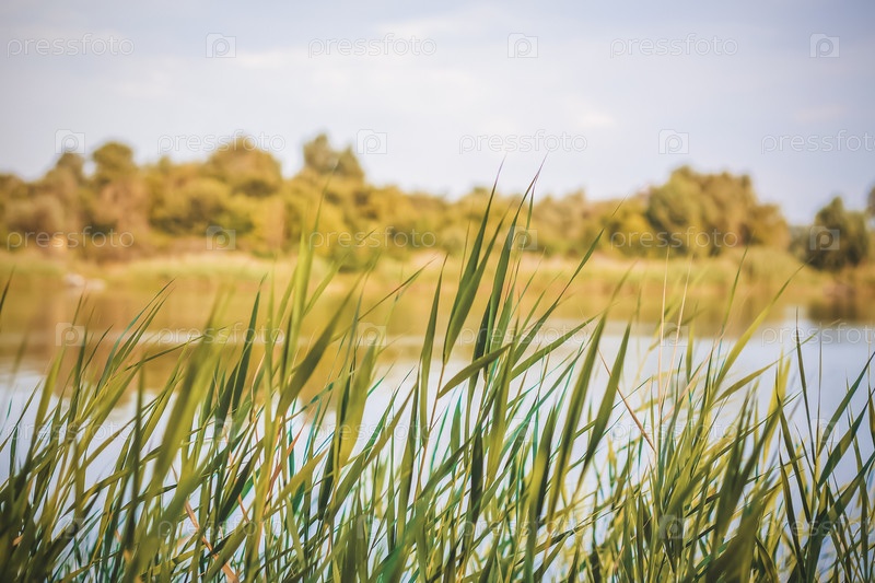 Пампасная трава на озере, тростник, семена тростника. Камыши на озере качаются на ветру на фоне голубого неба и воды