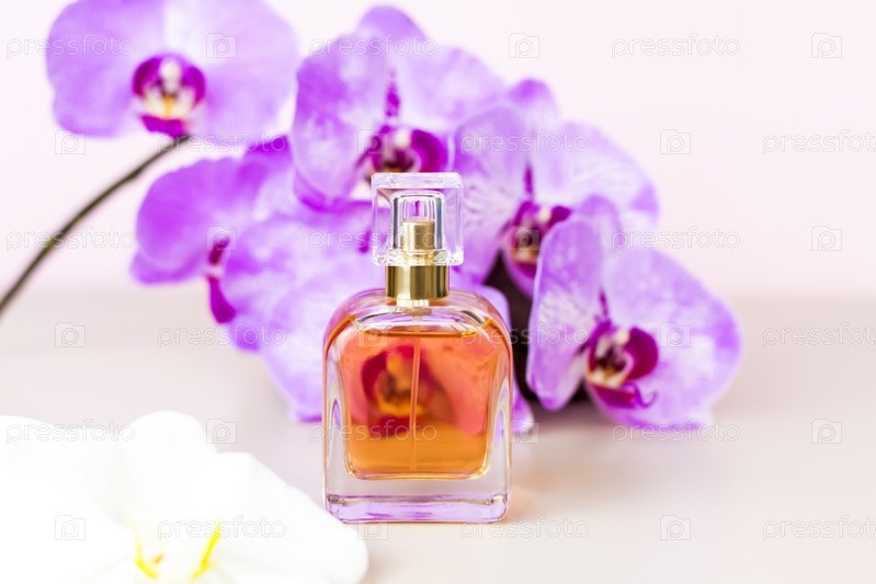 Флакон духов на розовом фоне вокруг красивых цветов орхидеи. Стильный внешний вид, планировка, индивидуальность. Баннер, место для текста
