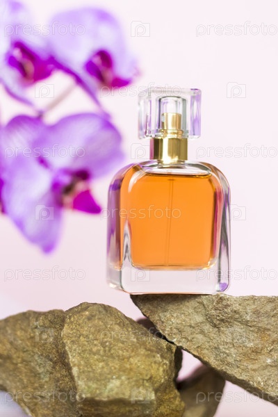 Флакон духов стоит на камне на фоне красивых орхидей. Стильный внешний вид, планировка, индивидуальность. Баннер, место для текста