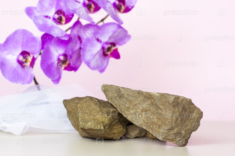 Нежный фон для презентации косметической продукции. Камни и цветы орхидеи. Стильный внешний вид, планировка, индивидуальность. Баннер, место для текста