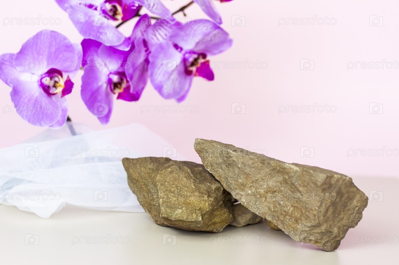 Нежный фон для презентации косметической продукции. Камни и цветы орхидеи. Стильный внешний вид, планировка, индивидуальность. Баннер, место для текста