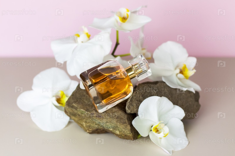 Флакон духов стоит на камне на фоне красивых орхидей. Стильный внешний вид, планировка, индивидуальность. Баннер, место для текста