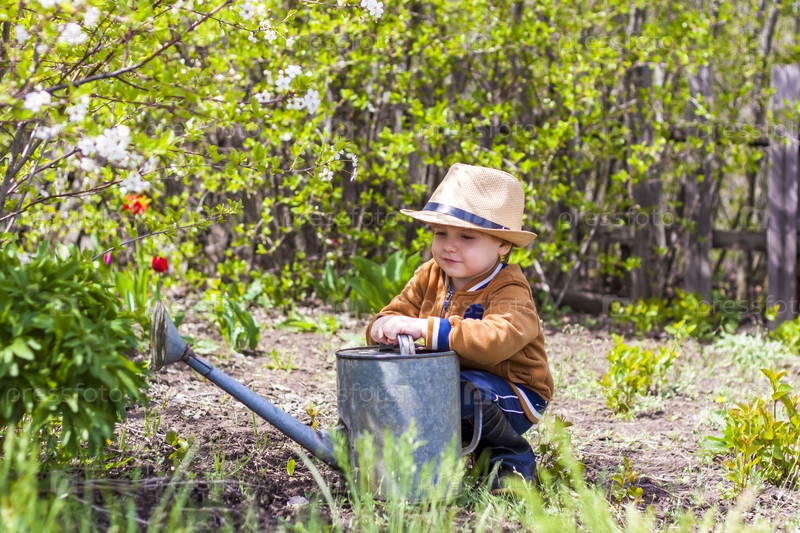 Симпатичный маленький мальчик в шляпе и резиновых сапогах поливает растения лейкой в саду. Очаровательный малыш помогает своим родителям выращивать овощи
