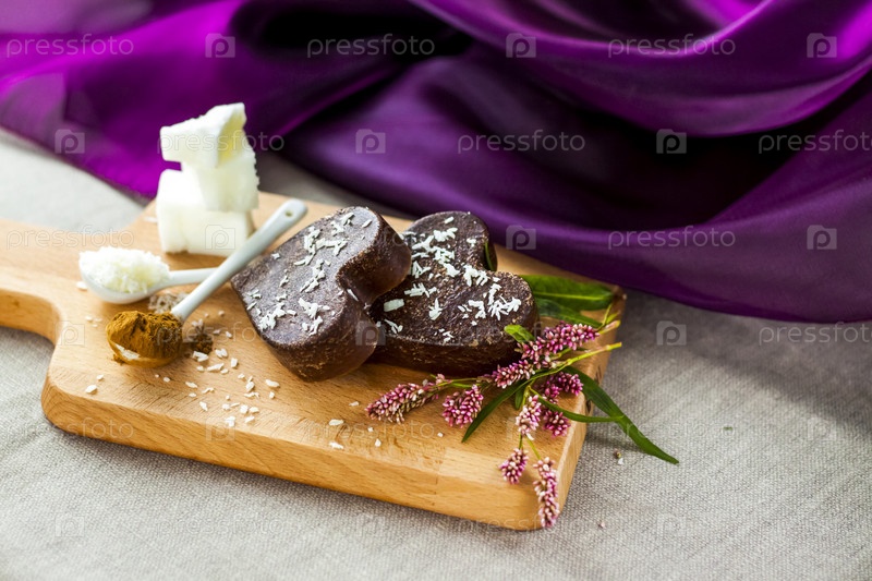 На столе конфеты ручной работы из кокосового масла, кокосовой стружки и какао. десерт по рецепту правильного питания