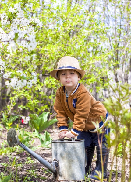 Симпатичный маленький мальчик в шляпе и резиновых сапогах поливает растения лейкой в саду. Очаровательный малыш помогает своим родителям выращивать овощи
