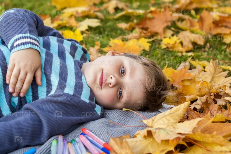 Осеннее настроение. Мальчик бросает желтые кленовые листья. Осенний портрет ребенка в желтой листве. Зрение. Милый, заботливый мальчик