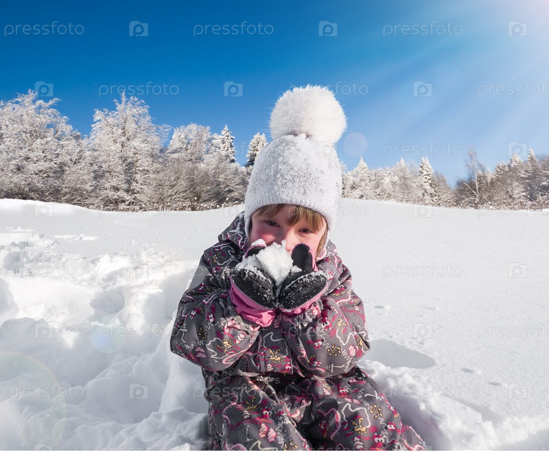 Ребенок играет со снегом в яркий солнечный день в лесу