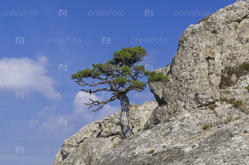 Реликтовая сосна на крутом скальном склоне на фоне синего неба. Крым, солнечный день в сентябре