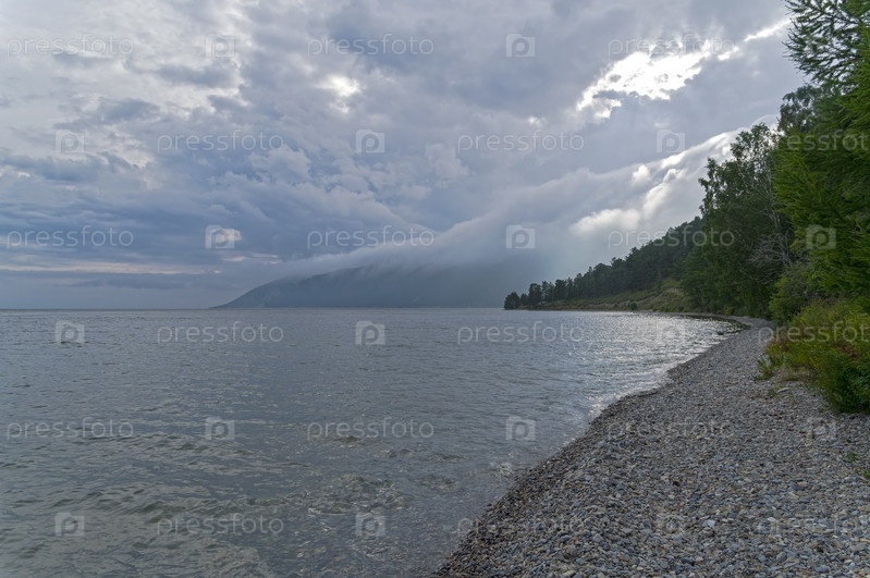 Низкая облачность над Байкалом, облака скрывают вершины прибрежных гор
