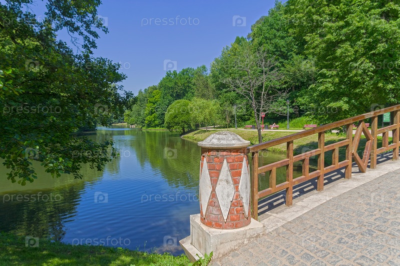 Вид с пешеходного мостика на Верхний Царицынский пруд. Царицынский парк, Москва, Россия. Солнечный день в июне