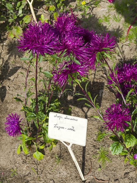 Цветущие ярко-фиолетовый астры под ярким сентябрьским солнцем с табличкой с названием сорта ( "Бизнес-леди"). Аптекарский Огород (филиал ботанического сада МГУ). Москва
