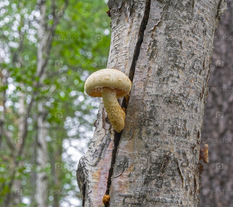 Опенок растет из трещины на стволе березы