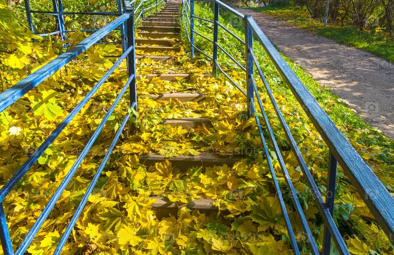 Лестница в парке, засыпанная опавшими кленовыми листьями. Солнечный день в октябре