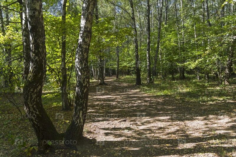 Пятна солнечного света на пешеходной дорожке в ландшафтном заказнике Теплый Стан. Солнечный день в сентябре