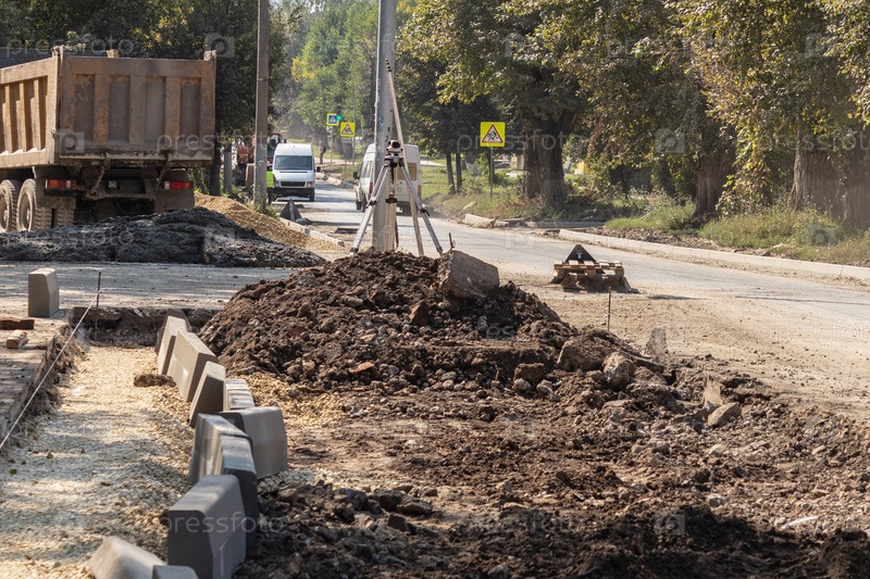 Строительно-маркшейдерское оборудование теодолитный нивелир при ремонте проезжей части. Тульская область, Россия