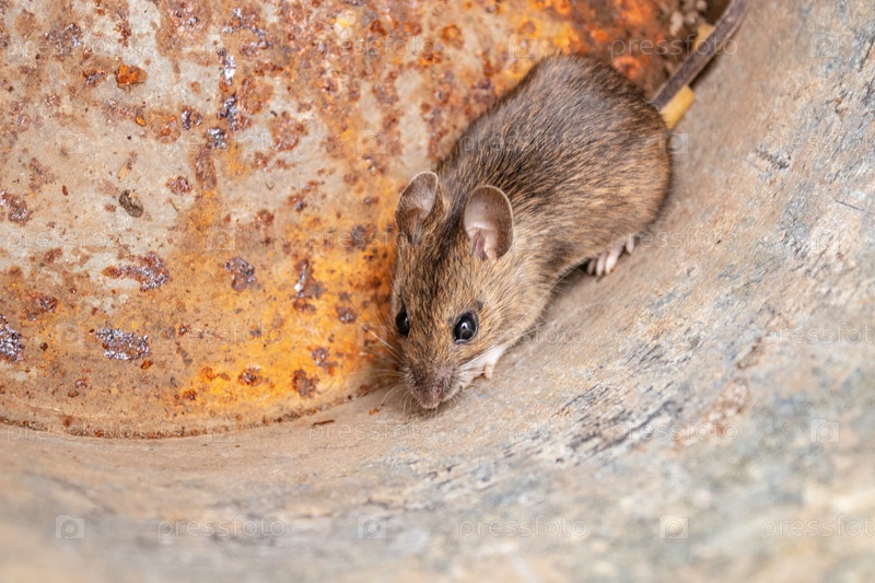 Маленькая домашняя мышь на ржавом металлическом фоне, крупный план