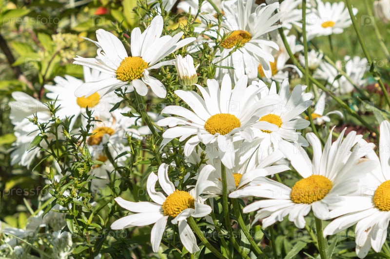 Ромашки, цветы ромашки, полевые цветы, цветы ромашки на участке в летний день. крупным планом