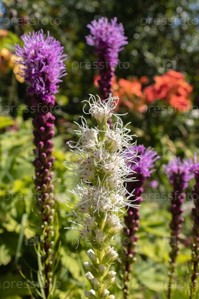 Фиолетовые цветы Liatris spicata на фоне зеленых листьев, летние цветки на участке. крупный план