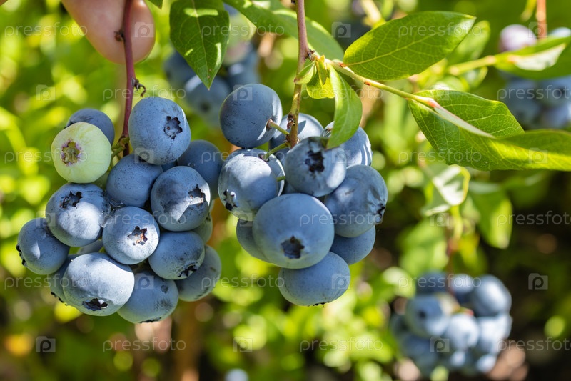 Садовый голубь вкусная, полезная ягода. Vaccinium corymbosum, высокорослый голубь. Голубые спелые ягоды на здоровом зеленом растении. Поле черники, фруктовый сад