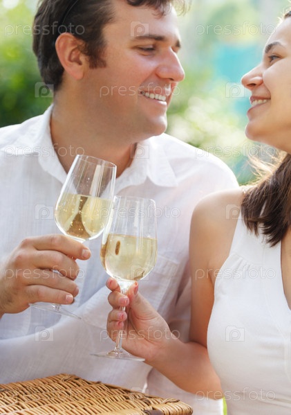 Молодая пара с бокалами с вином в руках