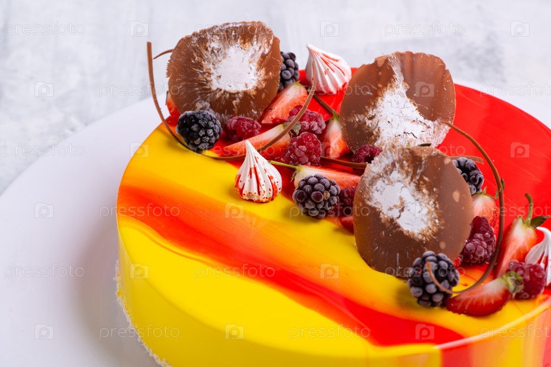 Крупный план торта с зеркальной глазурью, украшенного ягодами