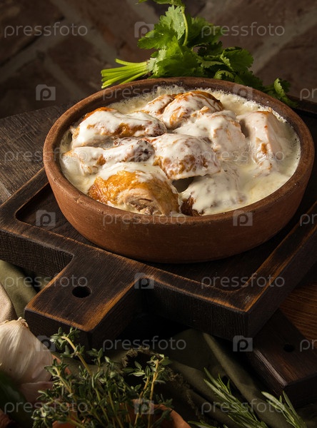 Вертикальный снимок курицы в сливочном соусе