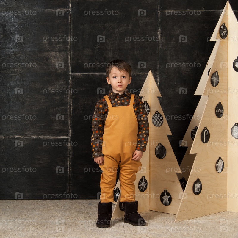 Маленький мальчик рядом с декоративными елками