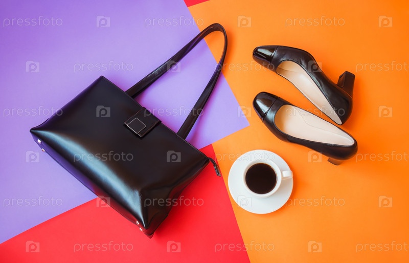Черная кожаная сумка, обувь и чашка кофе. Вид сверху