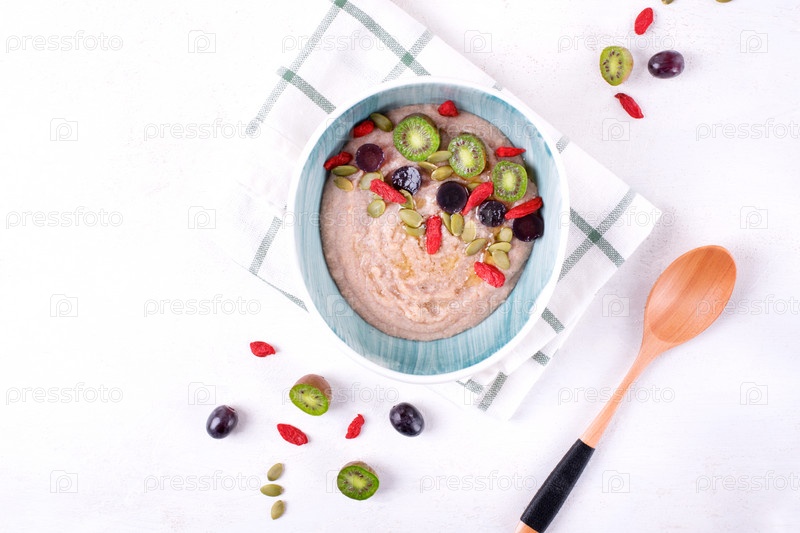 Сливочная каша фарро подается с мини-киви, виноградом, ягодами годжи и тыквенными семечками в миске. Молотые хлопья из полбы в качестве здорового завтрака. Вид сверху